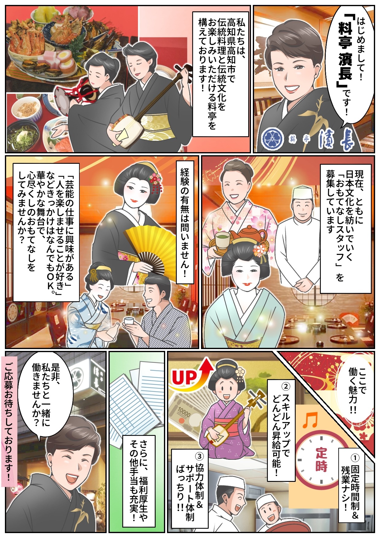 | 仕事内容 | ご予約いただいたお客様の席に入り、おもてなしスタッフとして接客します。 ≪具体的には…≫ ■お酌 ■舞の披露 ■お座敷遊び など 経験の有無は問いません! 「芸能の仕事に興味がある」 「人を楽しませることが好き」「ウェイトレス・仲居として働きたい」 などきっかけはなんでもOK。 意欲あるあなたをお待ちしています! |